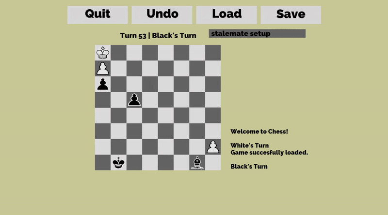 Game of chess with full ruleset. Includes piece movement, capturing, and end conditions. Also includes additional features like game saving, game loading, and undo. Includes a custom-made chess engine opponent.